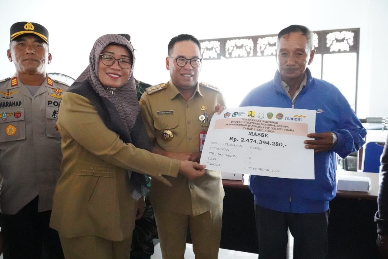 KPFM PENAJAM - Penjabat (Pj) Bupati Penajam Paser Utara (PPU) Makmur Marbun secara simbolis menyerahkan ganti rugi tahap pertama bagi masyarakat terdampak pembangunan Bandara VVIP pada Selasa (27/2/2024). Ganti rugi tersebut untuk tanam tumbuh pada sisi udara.